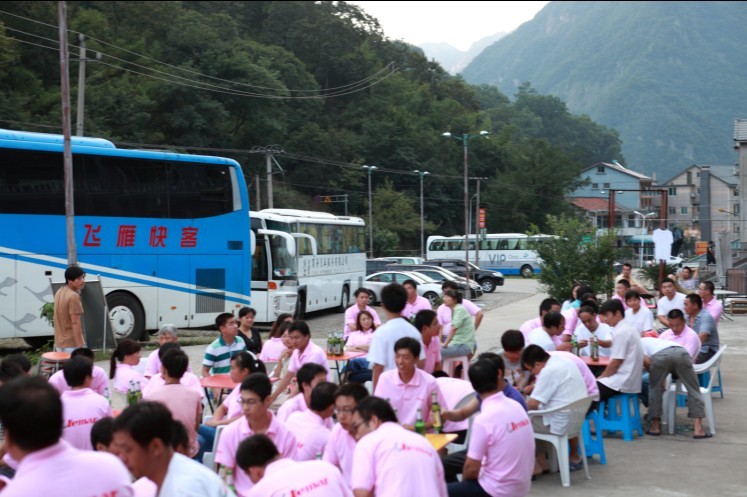 8月17日,旅游首日,上午三輛豪華大巴抵達安吉,游覽【竹博園】。在翠竹叢中,觀賞獨具匠心的造景藝術(shù),閱覽源遠流長的竹子傳說和典故。行走于竹峰棧道,著實體驗了一番竹林騰飛的意境。農(nóng)家午餐略作休憩,全員抵達【黃浦江源漂流】景區(qū)。當(dāng)多艘竹筏在風(fēng)光迷人、碧水映天的畫卷中靈動,當(dāng)百余摯朋在嬉鬧樂呵、心神騰飛的境界里共鳴, 艷陽高照,歡歌四起,每個力馬人的笑容都如水天一色般迷人。漂流結(jié)束,入住農(nóng)家,舉辦“篝火晚會”,多項互動節(jié)目寓教于樂,重申企業(yè)理念,抒發(fā)人文關(guān)懷。