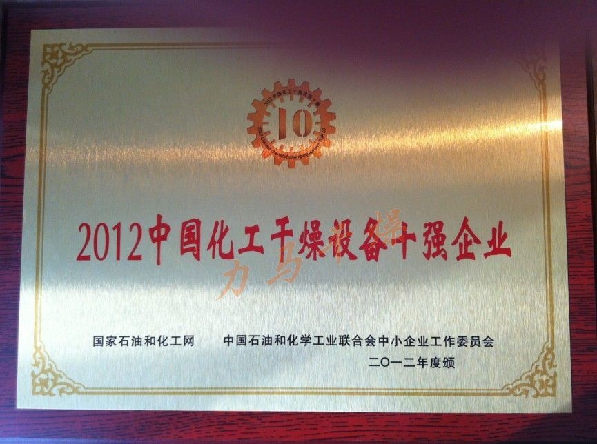 憑借2012優(yōu)異的銷售業(yè)績(jī),卓越的企業(yè)管理水平,精湛的生產(chǎn)制造能力,周到的售后服務(wù)水準(zhǔn),常州力馬干燥工程有限公司獲評(píng)“2012中國(guó)化工干燥設(shè)備十強(qiáng)企業(yè)”。