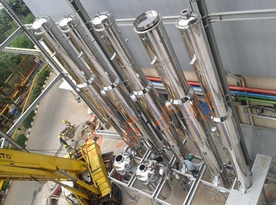 5:濃縮 濃縮一般分為真空濃縮、離心濃縮和冷凍(濃縮,這里采用真空濃縮。它通過真空降低水的沸點(diǎn),真空度達(dá)-0.08Mpa以上,此時水的沸點(diǎn)只有60度左右,從而使液體加快濃縮,濃縮液的濃度一般不超過60%(折光度計(jì))。由于從蒸發(fā)塔出來的濃縮液溫度高于常溫,因此必須經(jīng)過冷卻再送入貯罐,從而減少流失。