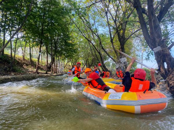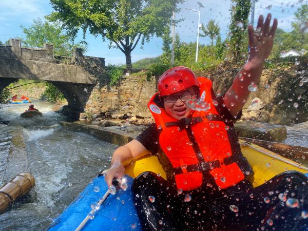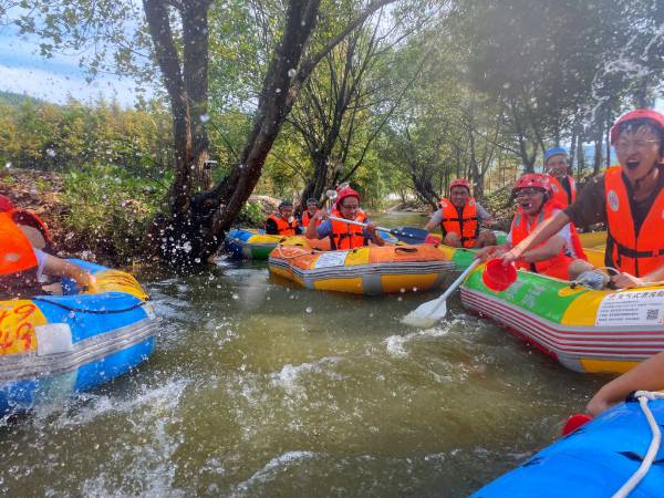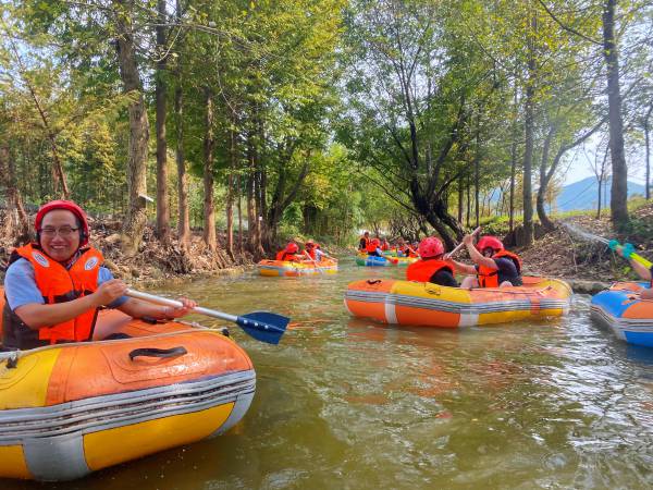 午餐過后,大家驅(qū)車前往竹海漂流。安全裝備準備完畢后,兩人一組,漂流之旅拉開帷幕。